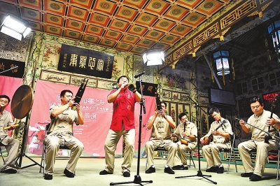 7月22日,非遺傳承人杜杏栓(右五)吹奏嗩吶。當日,“山西忻州文化遺產(chǎn)精品展示月”系列活動在北京恭王府開幕。新華社發(fā)